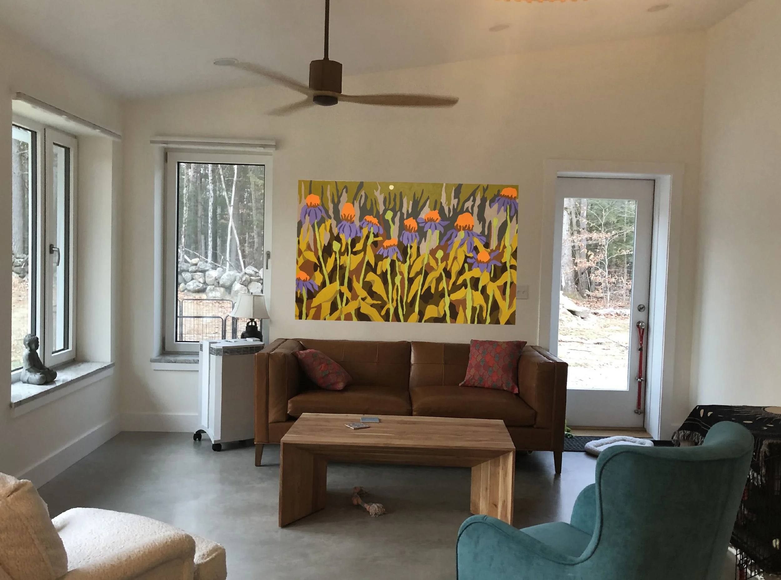 What I wasn’t expecting was the sense that the artist is in the room with me every day, too. Not in an intrusive way, but in a manner that makes me feel his presence, ever so subtly. It’s incredible, a new iteration of our relationship. It’s like Kevin’s artistic vision has been woven into my space, and I am just a bystander watching the conversation in the morning sunlight and the evening dusk. And what also surprises me, is I never tire of this dialogue. The painting has become the altar to the trees just outside the windows on either side, manifesting my personal religion of the forest, and by extension, nature.